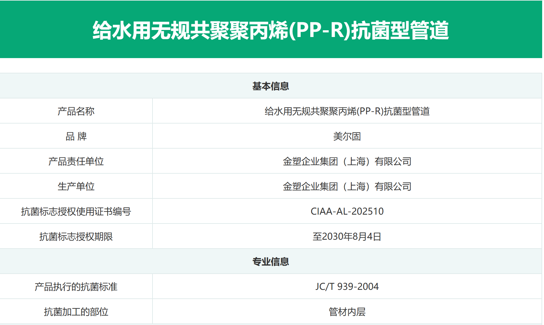 抗菌PP-R管性能引領業(yè)界追求,金塑企業(yè)集團(上海)有限公司獲得抗菌標志使用授權(quán)